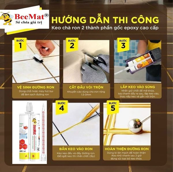 Định mức sử dụng: Từ 5m2 - 10m2/tuýp 400ml tùy kích thước đường ron và kích thước loại gạch